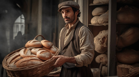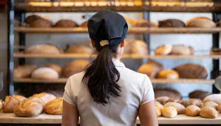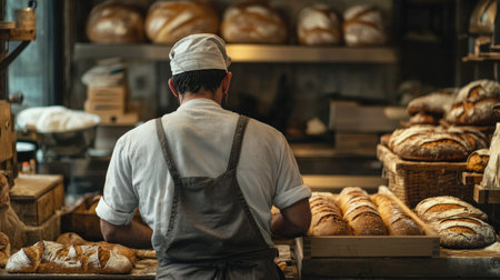 A rear-view of a baker in a traditional artisan bakery surrounded by various breads. Generated with AI