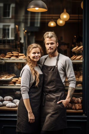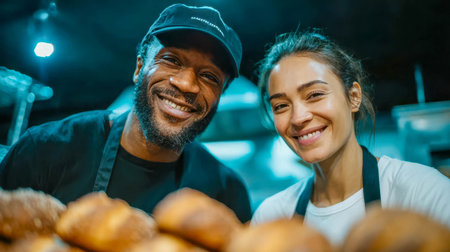 Smiling bakers posing proudly with fresh pastries in a warm, inviting bakery environment.