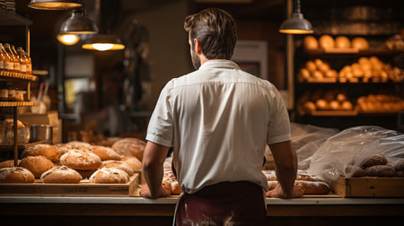 Rear view of a male baker standing in a bakery and looking at the shelves with fresh bread Generative AI