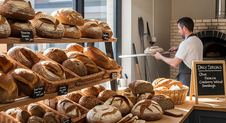 A sunlit artisan bakery displaying various loaves of fresh sourdough bread in wicker baskets on wooden shelves. In the background, a baker in an apron is using a peel to take a loaf out of a brick oven. A chalkboard menu lists daily specials.