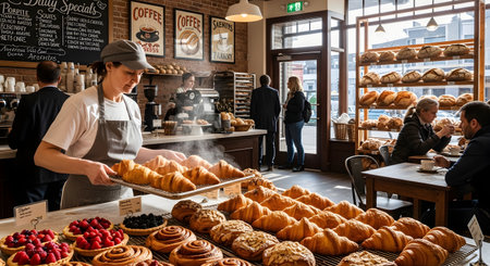 A female baker carries a tray of fresh, golden croissants in a bustling bakery shop filled with the aroma of baked goods. Customers are seated at wooden tables in the background, enjoying coffee and pastries.