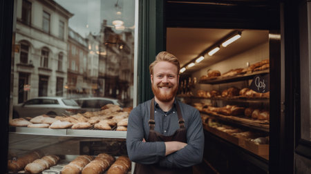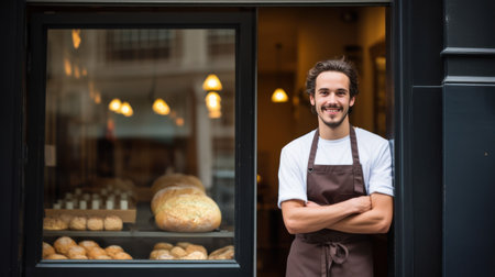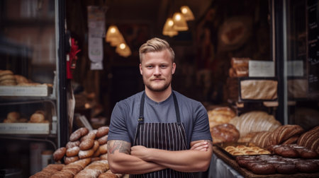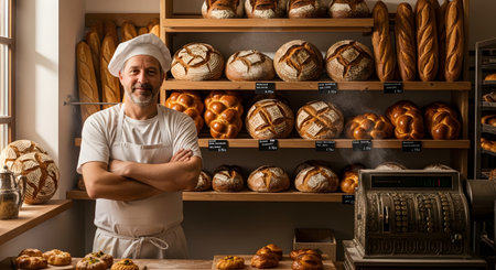 A confident male baker stands in his bakery shop with his arms crossed, smiling at the camera. Behind him, wooden shelves are stocked with a variety of fresh artisan breads, and a vintage cash register sits on the counter.