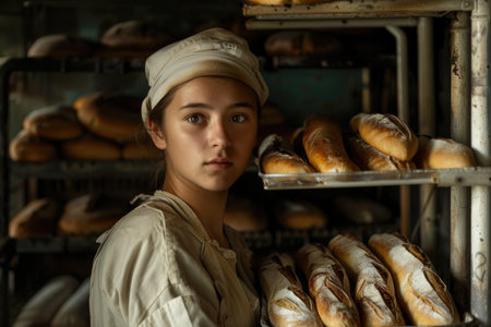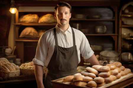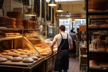 A baker perspective from behind, working diligently in a rustic bakery, crafting freshly baked bread with precision and passion