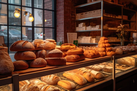 Arranged Freshly-Baked Artisan Bread, Loaves and Pastries on Display Shelves in a Modern Bakery Shop