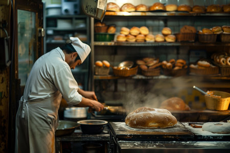 This enchanting bakery scene features an artisan baker skillfully preparing a variety of fresh bread and pastries in a rustic kitchen atmosphere. The warm lighting and aromatic smoke create a cozy ambiance.