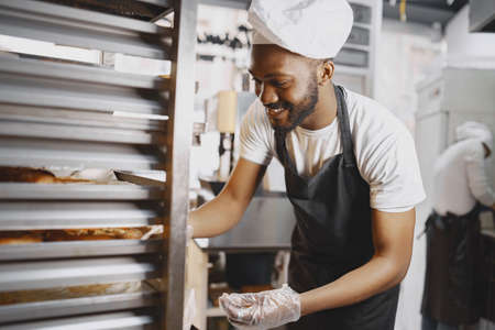 The picture of the baker of the bakery looking at the camera and wearing the apron also work inside the baker that make the various kind of the bread and sweet yet need much experience to work. AIG43.