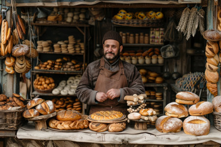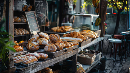 Open-air bakery market stall, aromas inviting, fresh mornings allure