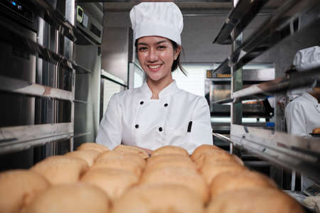 Young Asian female chef in white cook uniform and hat showing tray of fresh tasty bread with smile, looking at camera, happy with his baked food products, professional job at stainless steel kitchen.