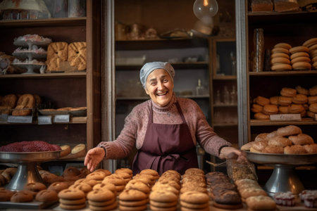 Elderly woman in a bakery shop. Bakery store happy owner. AI Generated
