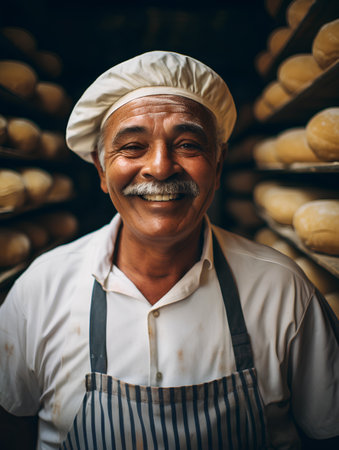 Mature baker at stove bakery making bread. Professional chef baking in oven. Generative AI