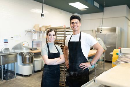 Portrait of two young bakers working as a team in a bakery kitchen and smiling