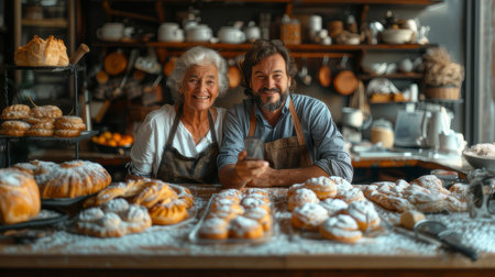 An elderly woman and her adult son share a joyful moment in a cozy bakery, surrounded by an assortment of freshly baked bread and pastries. Both wear aprons, suggesting their active participation in baking.