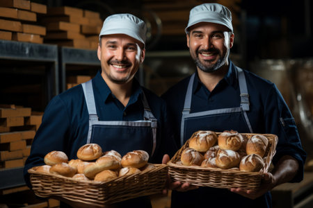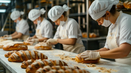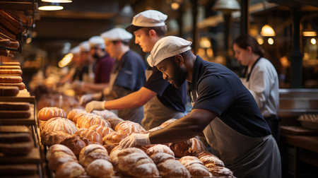 Group of Professional Bakers with Freshly Baked Bread and Pastries at a Modern Bakery Production Facility AI Generative