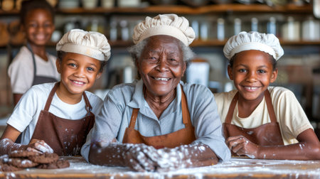 happy grandmother with grandchildren preparing cookies from dough and flour in the kitchen. Family values, two generations concept