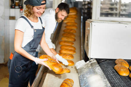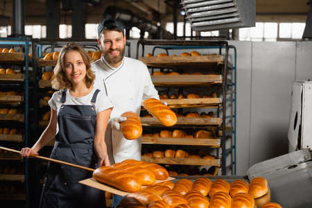 Young bakers with a wooden shovel with bread in their hands against the background of shelving with bread in a bakery. Industrial bread production