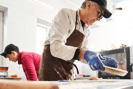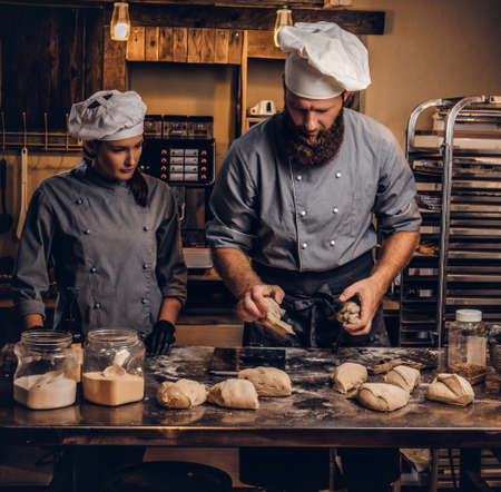 Good looking couple of entrepreneurs standing inside their bakery and making some bread