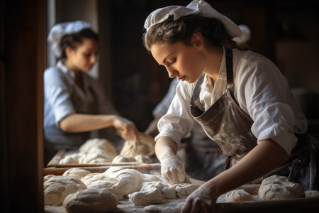 Two women working together in a bakery, engaged in the process of making bread, Women in bakery preparing dough, AI Generated