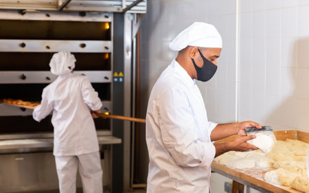 Bakery worker in protective mask cuts raw dough with knife to prepare for baking