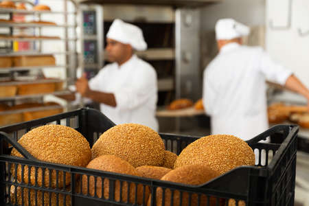 Freshly baked hamburger rolls. Young cooks checking the quality of the buns looking for flaws and seeking perfection. Communication and teamwork concept