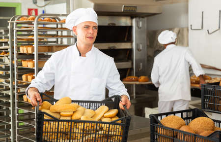 A worker at a bakery takes fresh bread out of the oven. Industrial production