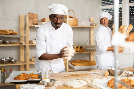 Good looking bakers making pastries and loaves of bread in a bakery kitchen