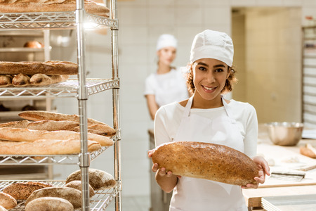 Smiling spanish female cooks with fresh and tasty bread in bakery