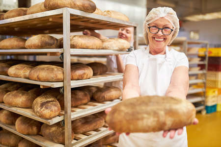 Older woman as a baker in front of a tray trolley with bread proudly shows a fresh organic bread
