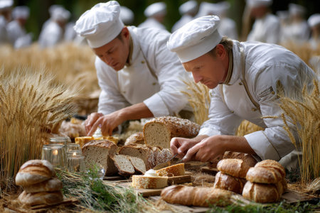 Two bakers work diligently to slice and prepare various types of artisan bread in a natural outdoor environment.