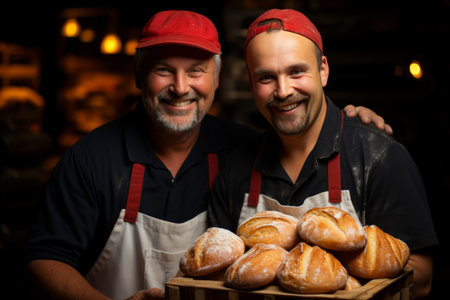 Successful bakers in workwear standing by workplace against display with bread assortment