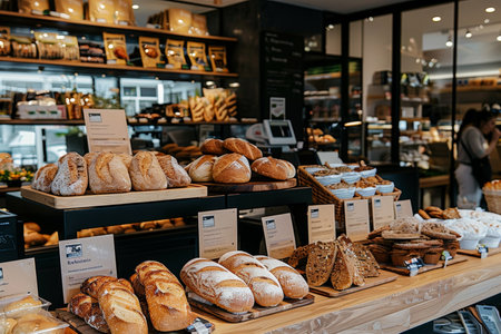 Freshly baked assortment of bread and pastries in a modern bakery shop display