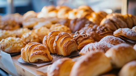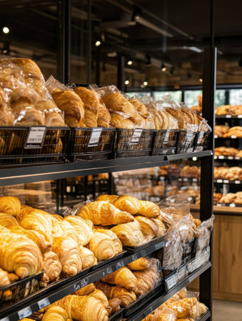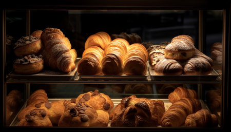 Freshly baked croissants and pastries sit on display in a bakery, tempting customers with their golden brown color and sweet aroma