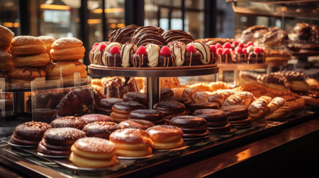 A tempting display of gourmet pastries in a cozy cafe, with a warm, inviting glow that entices the senses and invites indulgence.