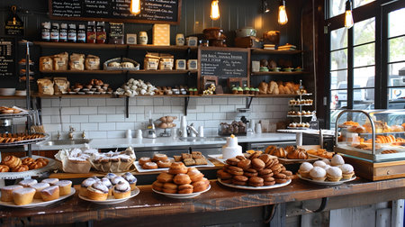 A cozy bakery filled with a variety of freshly baked breads and pastries. Ideal for themes of food, baking, and culinary arts.