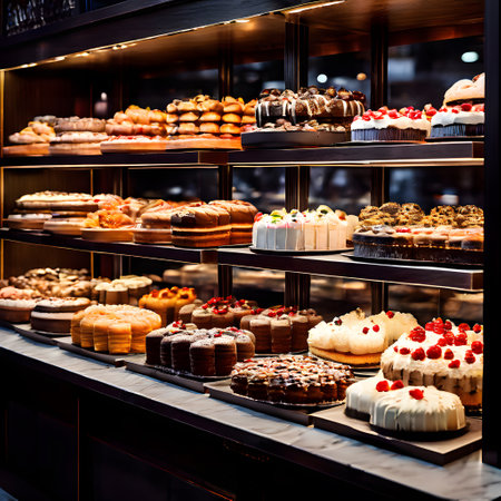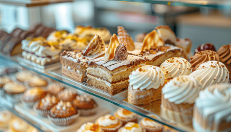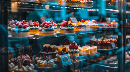 Assorted pastries and cakes are beautifully presented in the showcase of a bakery shop