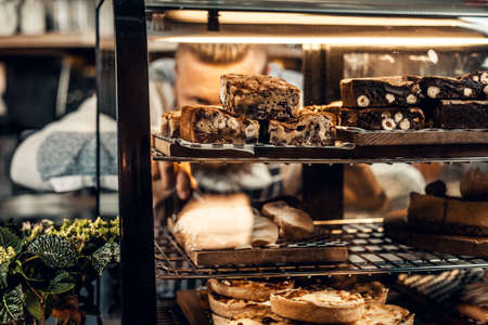 Cakes On Display In Cafe Close Up With People Blurred On Background
