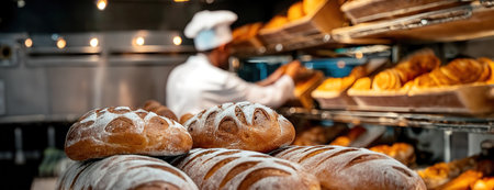 Freshly baked bread in a bakery, with a man baker in the background, traditional baking methods and the appeal of freshly made goods..