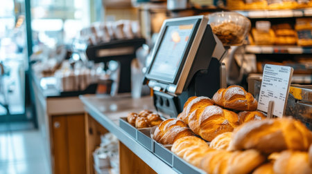 Rows of golden-brown baked goods on display with a tidy, well-organized checkout counter, bright and spacious supermarket setting