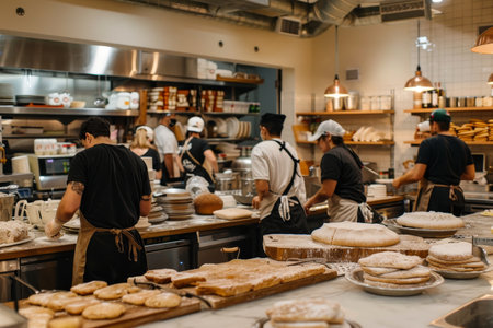 Several individuals in a kitchen preparing food amidst flour-dusted countertops, A bustling kitchen with flour-dusted countertops and busy bakers