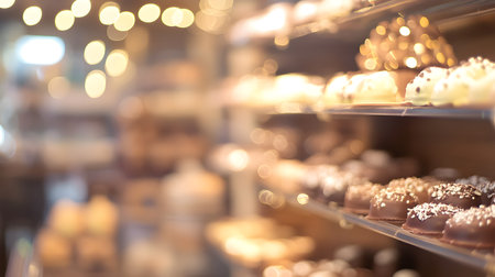Warmly lit blurred bakery interior showcasing fresh pastries and rustic decor