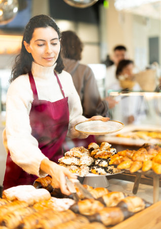 Young woman preparing pastry for sale in supermarket bakery department. Bakery seller.