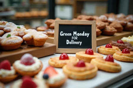 Green Monday bakery delivery promotion featuring desserts and pastries display.
