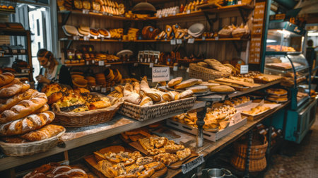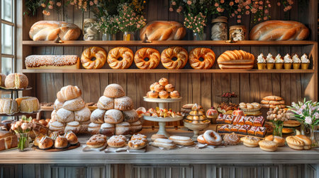 Artisan Bread and Pastries Display in Rustic Bakery Shop. High quality photo