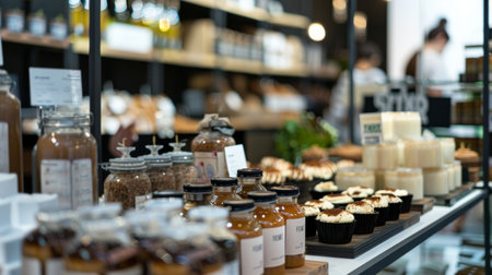 An assortment of gourmet products, jars, and desserts displayed in a modern store, highlighting a variety of high-quality and artisanal food items.