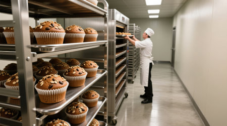Muffins cooling on racks in a commercial bakery with a baker in the background.