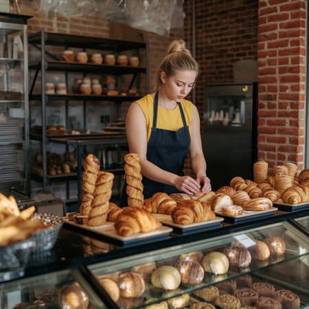In a well-lit bakery with a warm atmosphere, a young baker carefully arranges freshly baked pastries on display. The inviting setup features brick walls and various baked goods.