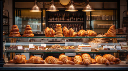 display of croissants and pastries in bakery, with selection of cookies and cakes visible, created with generative ai