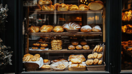 A bakery's glass window viewed from outside, showcasing warm bread, fluffy rolls, and freshly baked cookies, all arranged to entice with their golden crusts