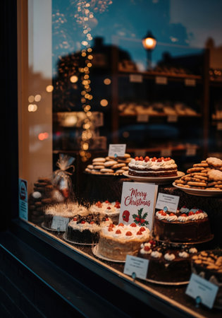 A warm and inviting scene of a bakery window filled with delicious treats and holiday cheer