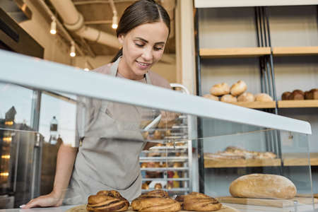 Young smiling female clerk standing by display with bakery assortment and checking buns