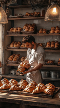 In a cozy bakery, a male baker arranges freshly baked croissants on a wooden shelf, the warm glow of the space highlighting the pastries